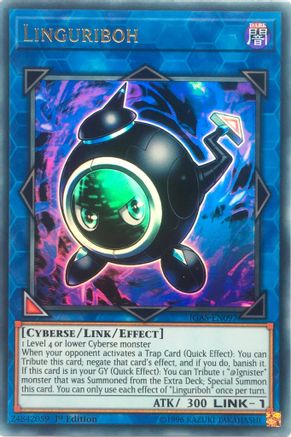 When your opponent activates a Trap Card (Quick Effect): You can Tribute this card; negate that card's effect, and if you do, banish it. If this card is in your GY (Quick Effect): You can Tribute 1 "@Ignister" monster that was Summoned from the Extra Deck; Special Summon this card. You can only use each effect of "Linguriboh" once per turn.